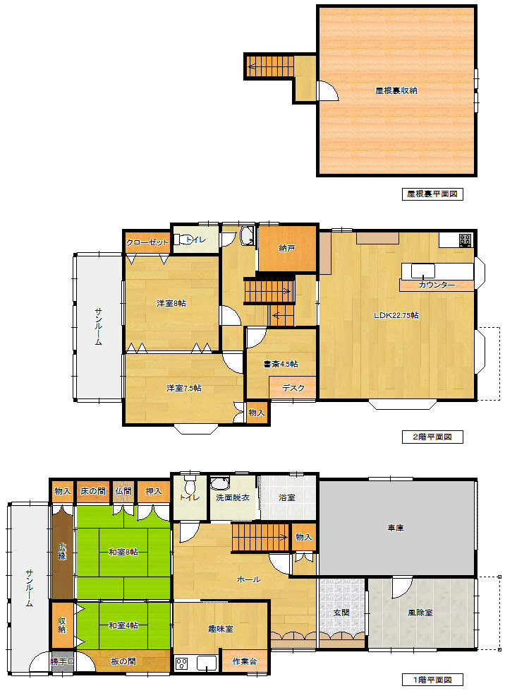 ビルトインガレージ及び趣味室、広い屋根裏部屋収納のある住宅です